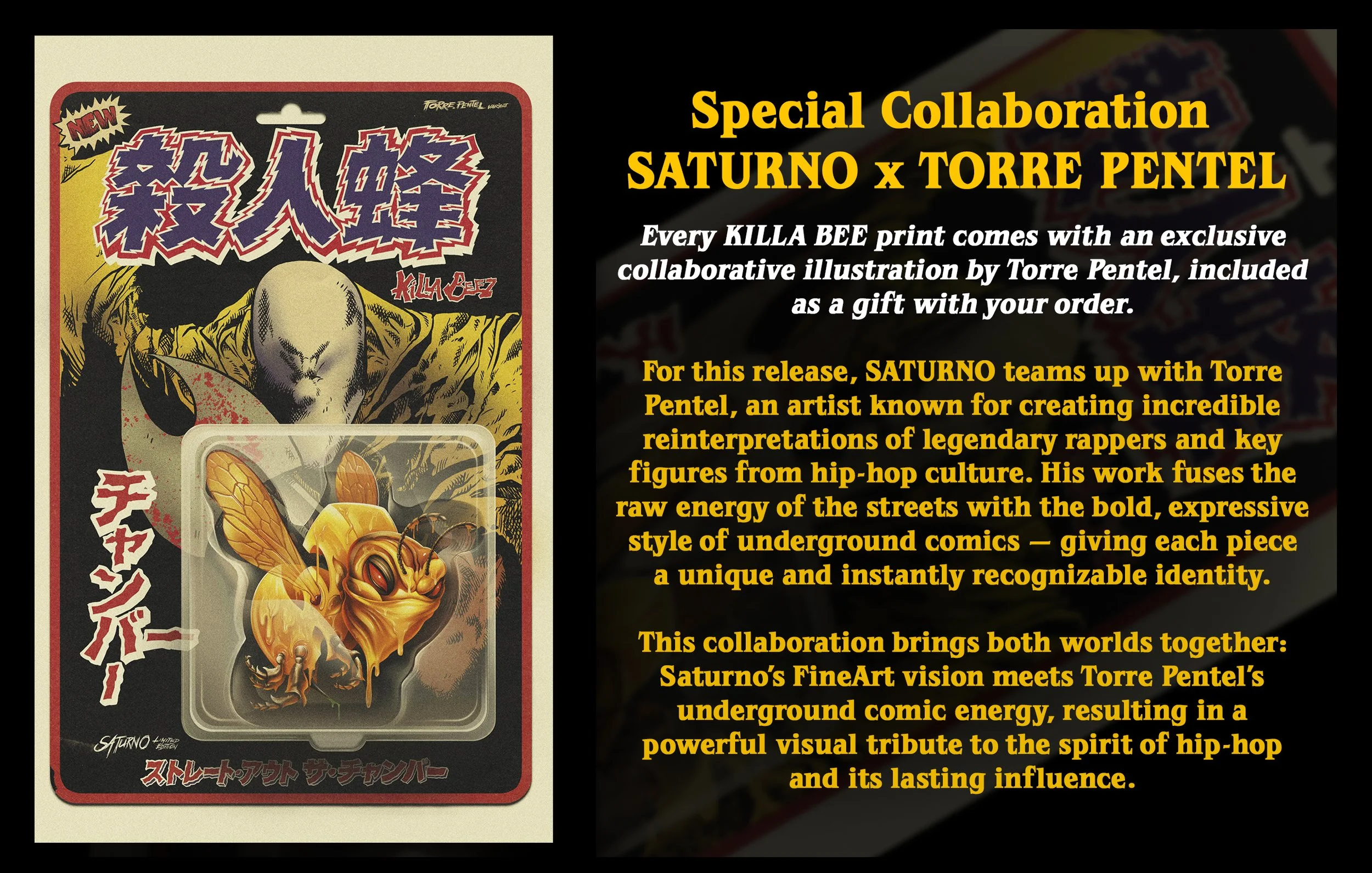 Inspired by the concept of the “Killa Bee,” this artwork reimagines the symbol of resistance, identity, and creativity that defined an era — brought to life through Saturno’s unmistakable style and precision.